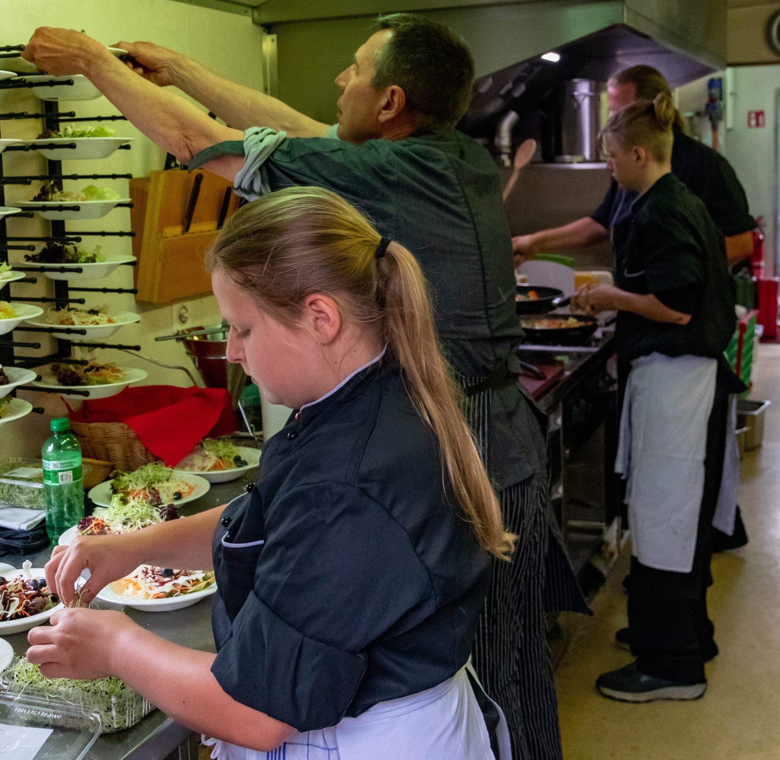 Wir kochen alles frisch auf dem Zug. Eine motivierte, junge Mannschaft ist an der Arbeit