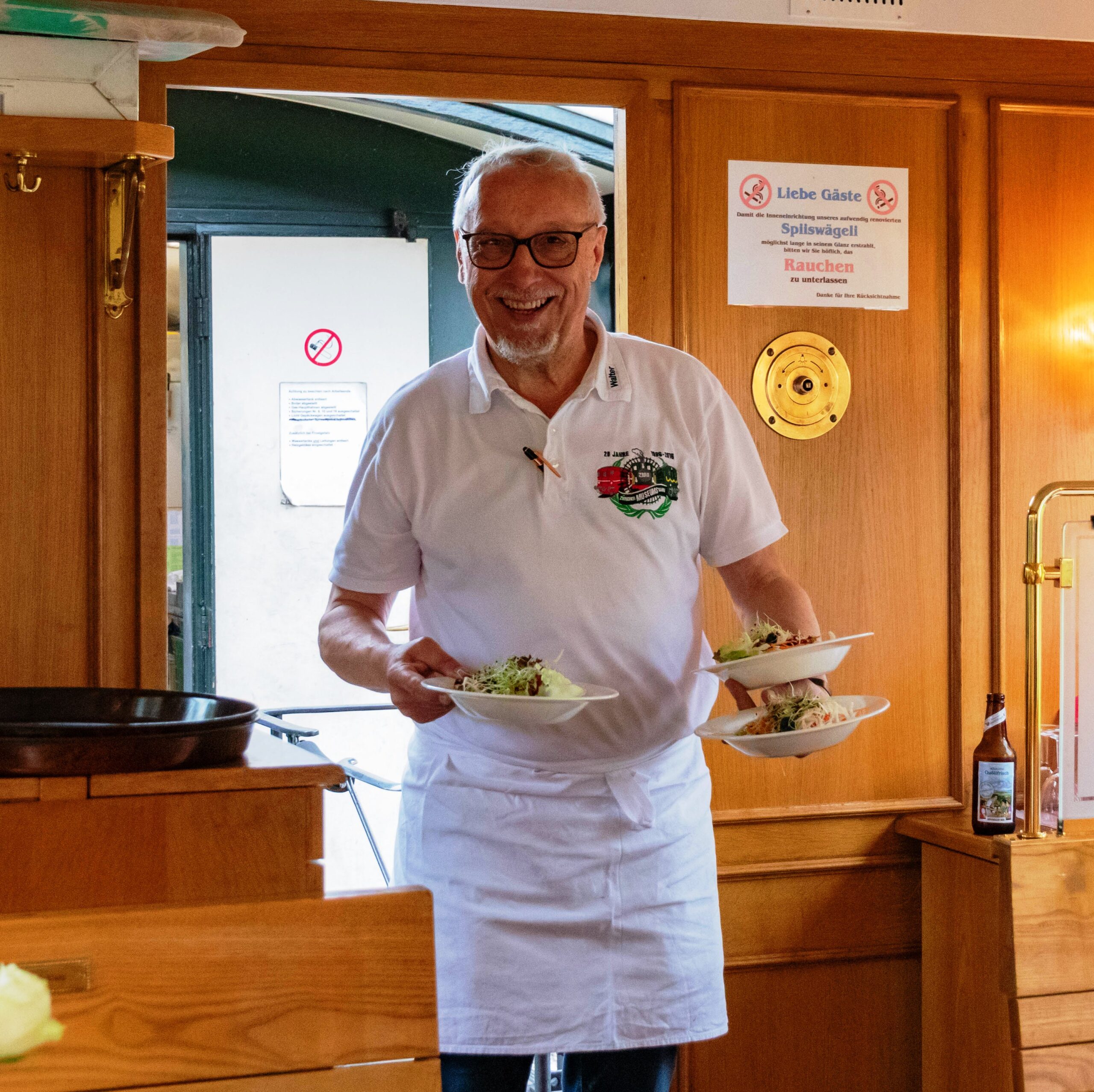 „Es ist etwas ganz Spezielles, in einer Küche in einem über 100 jährigen Eisenbahnwagen zu kochen. Wo gibt’s dies schon?! Wir kochen Gerichte „wie bei Mama“ und können dank der modernen Einrichtung ganz schöne Menüs zaubern, nicht nur an den öffentlichen Fahrten, sondern auch an Spezialanlässen. Wie es so ist: Küche ist viel Arbeit, darum sind wir um jede Unterstützung froh. Es lohnt sich!